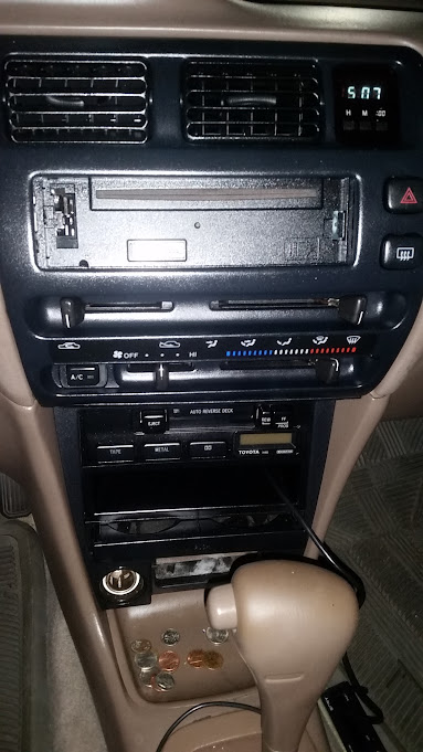 Old Kenwood stereo missing faceplate, Original Toyota add on tape deck and pocket below vents |