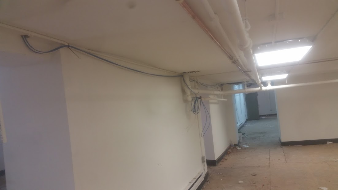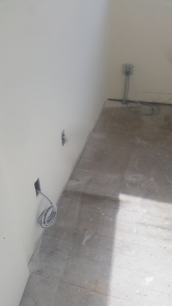 | Wiring pulled thru basement ceiling ready to be pulled upstairs in conduit. |