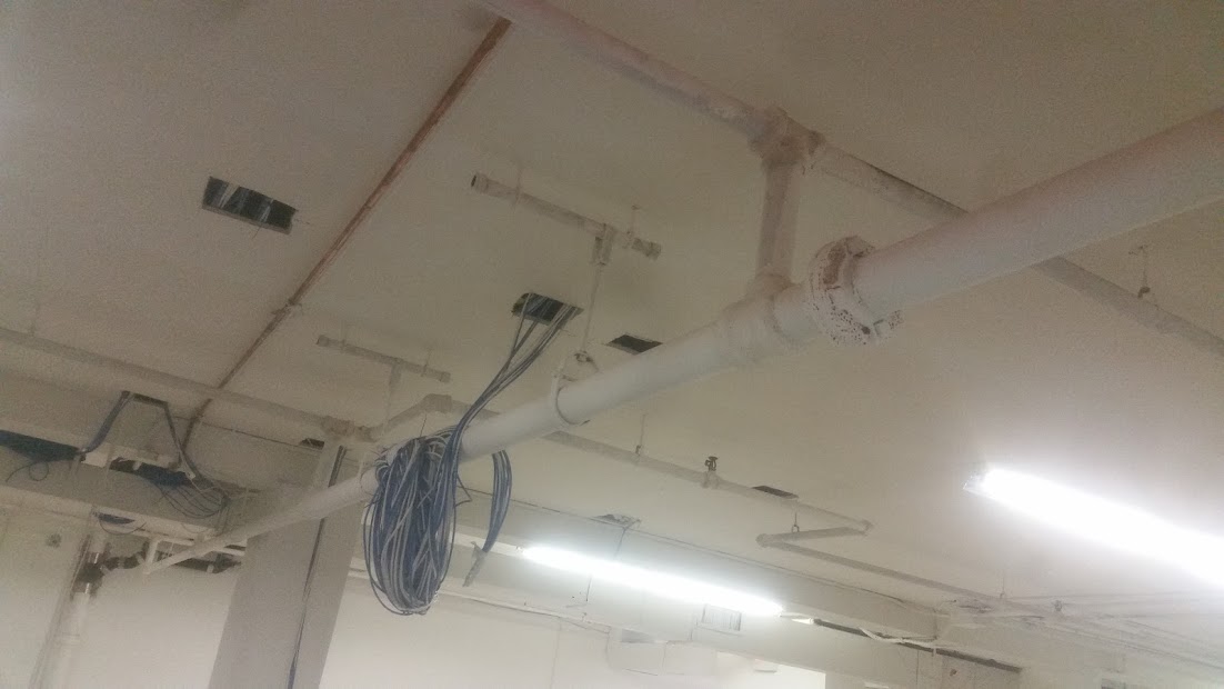 Strapped wires over a pipe in the ceiling, so wiring would be out of the way while we worked. |